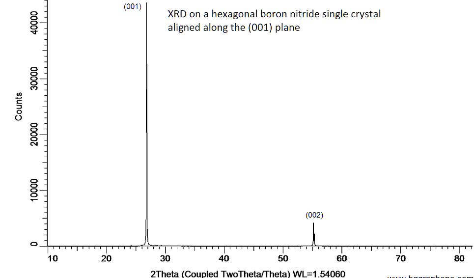 X-ray diffraction on a hexagonal boron nitride single crystal aligned along the (001) plane. XRD was performed at room temperature using a D8 Venture Bruker. The 4 XRD peaks correspond, from left to right, to (00l) with l = 1, 2, 3