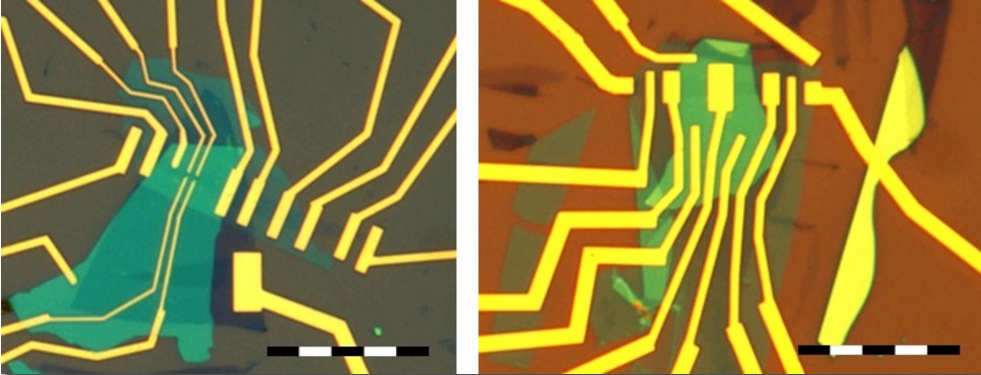 Device at left side: Fabrication of a high mobiltity bilayer graphene. This field effect transistor is fabricated using the polymer 2D_CL_PC ( click here ). The device is composed out of four 2D layers. The bilayer graphene is encapsulated between two hexagonal boron nitride crystals (h-BN). The fourth layer is a thin layer of graphite (HOPG) which is used as a backgate. Scale bar is 20μm. Device at right side: This device is similar to the one at the left side, here we added on the top hexagonal boron nitride layer a gold electrode in order to apply a top gate voltage to the hBN encapsulated bilayer graphene. Scale bar is 20μm