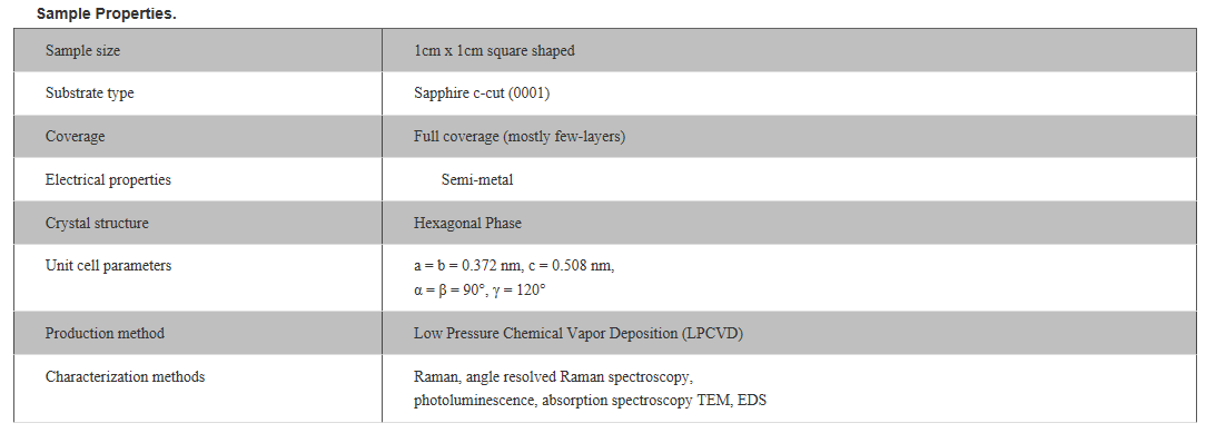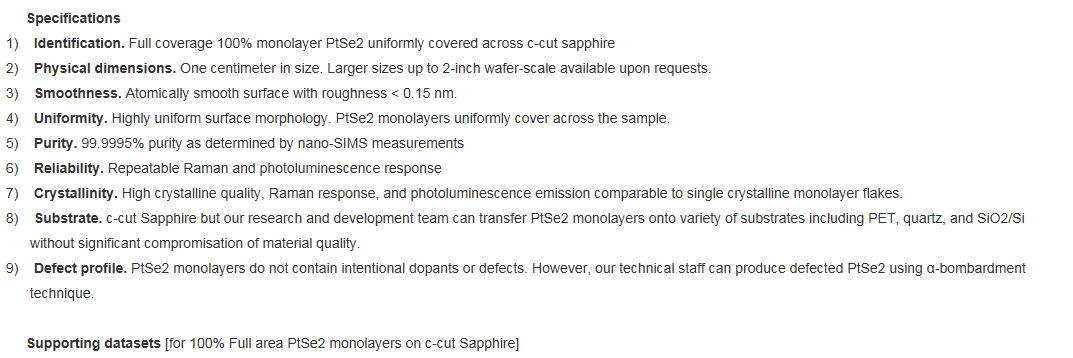 This product contains full area coverage PtSe2 layers (single/multi) on c-cut sapphire substrates. Sample size measures 1cm in size and the entire sample surface contains PtSe2 sheets. Synthesized full area coverage PtSe2 is highly crystalline, some regions also display significant crystalline anisotropy.