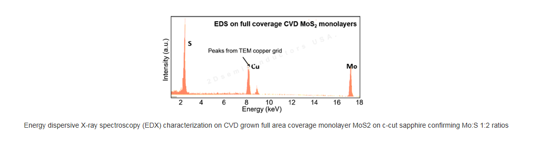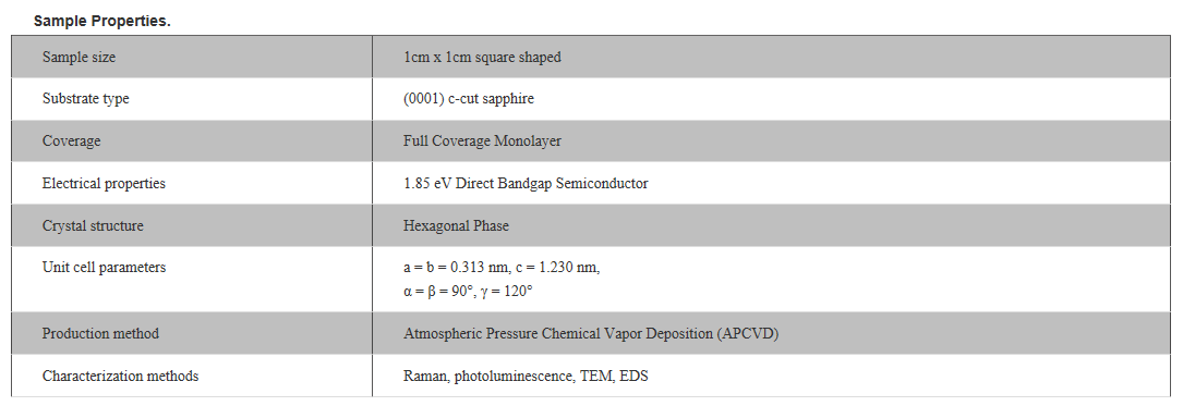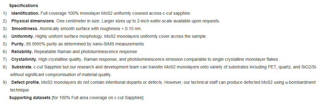 This product contains full area coverage MoS2 monolayers on c-cut sapphire substrates. Sample size measures 1cm in size and the entire sample surface contains monolayer thick MoS2 sheet. Synthesized full area coverage monolayer MoS2 is highly luminescent and Raman spectroscopy studies also confirm the monolayer thickness.