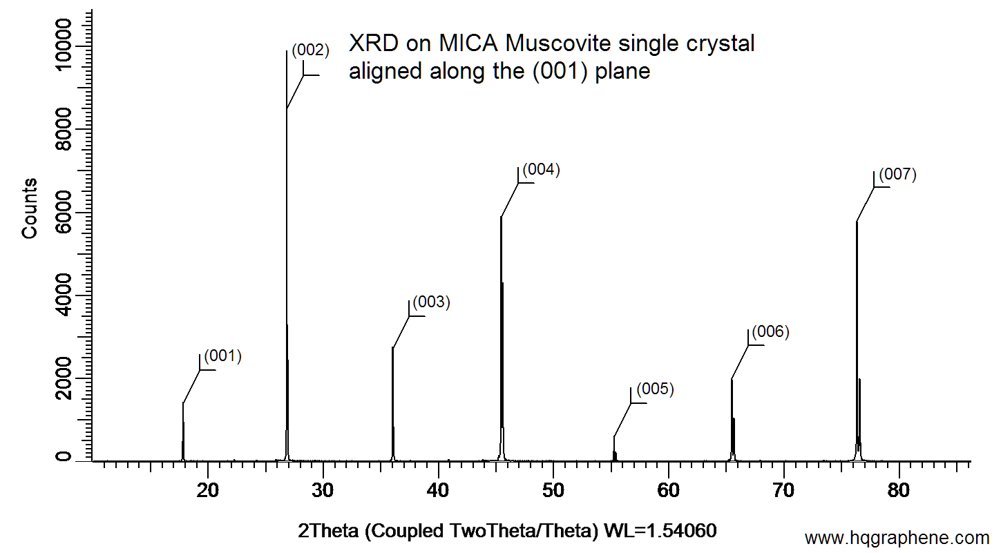 X-ray diffraction on a MICA Muscovite single crystal aligned along the (001) plane. XRD was performed at room temperature using a D8 Venture Bruker.
