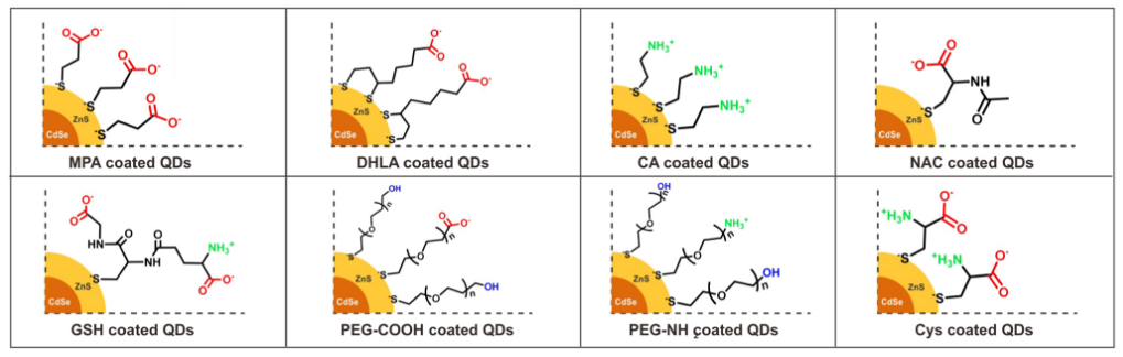 (1) 小分子類:3-巰基丙酸(MPA)\L-半胱氨酸(Cys)N-乙酰-L-半胱氨酸(NAC)、谷胱甘肽(GSH)、二氫硫辛酸(DHLA)、巰基乙胺(CA)等;