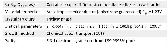 Tin sulfooxide is a ternary alloy belonging to M2X3 family of materials. Our crystals has the chemical formula of Sb2S3xO3(1-x) where x composition ratio has been fixed to x=2/3. However, if your research requires other ternary composition, please contact us to synthesize a new batch for your team. Sb2S2O ternary alloys are visible spectrum semiconductors with predicted band gap of 1.25 eV. These alloys provide transition across Sb2S3 and Sb2O3 compounds corresponding to x=1 and x=0.