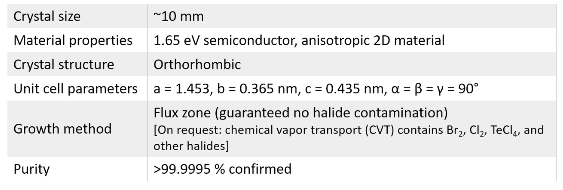 Our single crystal GeS (Germanium sulfide) crystals come with guaranteed optical, electronic, and structural anisotropy. They are developed at our facilities using state-of-art flux zone techniques. Each growth takes close to three months to provide you perfected crystals that does not contain any halides. Each crystal is highly crystalline, oriented in 0001 direction, and easy to exfoliate. In the bulk form GeS is 1.65 eV indirect band gap semiconductor. Displays remarkable and unusual optical, mechanical, and electrical properties in the monolayers. Monolayer GeS remains unknown by the scientific community and waiting to be discovered. Our R&D staff takes characterization dataset in each sample piece to ensure structural, optical, and electronic consistency. Please also see our GeS, GeSe, GeTe, GeAs, GeP, and Ge-based solutions.