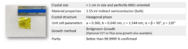 Large size hexagonal phase GaTe (Gallium telluride) crystals have been developed at our facilities using three different growth techniques, namely Bridgman growth, chemical vapor transport (CVT), and flux zone growth, to optimize grain sizes and reduce defect concentrations. In contrast to commonly used chemical vapor transport (CVT) technique, flux grown crystals are well known for their structural perfection and electronic/optical performance. Bridgman and flux zone methods both offer similar grade qualities. Each crystal very large in size to last for years, is highly crystalline, oriented in 0001 direction, and easy to exfoliate. Our R&D staff takes characterization dataset in each sample piece to ensure structural, optical, and electronic consistency.