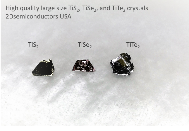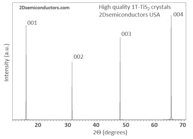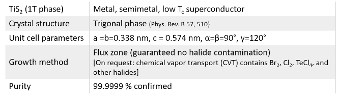 Our TiS2 crystals are stabilized in 1T ohase (semimetallic phase). They are grown using two different techniques through chemical vapor transport (CVT) or flux zone growth (see description of these two methods below). These crystals are treated as gold standards in 2D materials field owing to perfected electronic behavior with guaranteed phase transition and semimetallic responses. Our TiS2 crystals are notoriously known low impurity resistance (zero temperature resistance), high carrier mobility, extremely clean and sharp XRD peaks, and negligible amount of defects (see published results as well as CVT vs. Flux based methods below ). Our TiS2 crystals are large in size and ready for exfoliation without any preparation.
