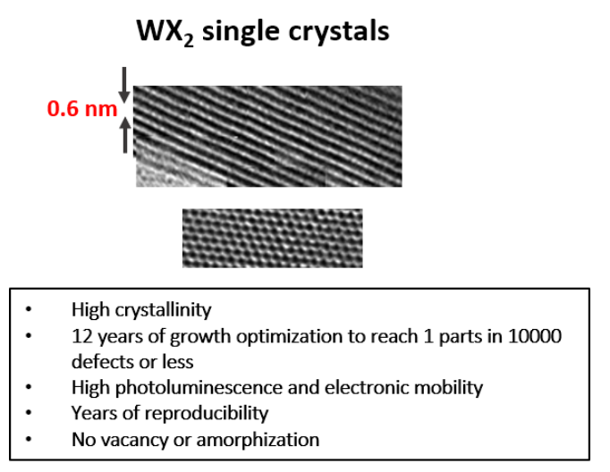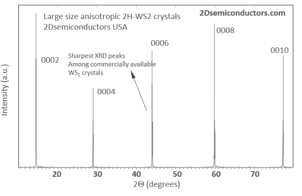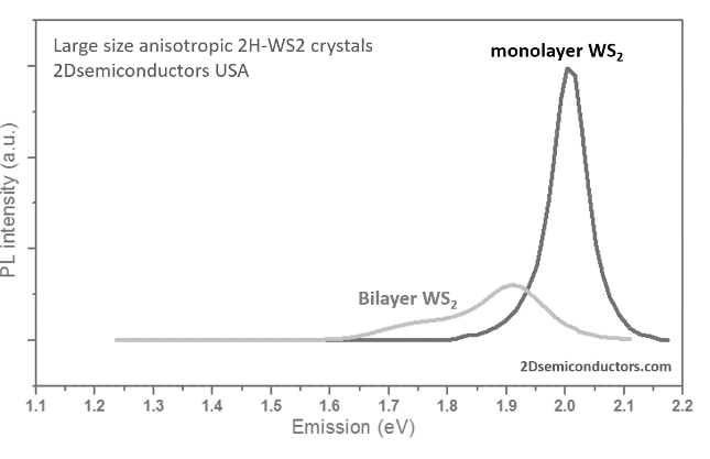 14 years of growth optimization in chemical vapor transport (CVT) as well as flux growth lead to our flawless WS2 crystals: Our large size (~1cm in size) vdW WS2 crystals are treated as gold standards in 2D materials field. Our n-type WS2 crystals are doped with Re or Au atoms at ~1E17-1E18 cm-3 range. WS2 crystals from 2Dsemiconductors are known for its superior valleytronic performance, perfect crystallization, defect free structure, extremely narrow PL bandwidths, clean PL spectra (free of bound exciton shoulders), and high carrier mobility. Thousands of scientific articles have cited us and used these crystals for scientific accuracy and clean signals. Please also see our n- and p-type WS2 crystals doped with Au, Re, Nb, or other transition metal atoms. Please note that doping into TMDCs greatly reduce the crystallization time (growth speeds), thus electronically doped TMDCs measure smaller than undoped (intrinsic) TMDCs.