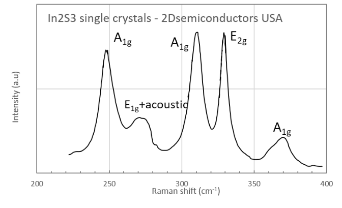 Gamma layered phase of In2S3 is a direct gap semiconductor with an optical band gap ranging from 2 eV - 3.25 eV. It's fundamental band gap nature (direct vs indirect) and its value have been much debaded in the field and remains open ended. In2S3 is particular attractive semiconductor for photoelectrochemical, solar cell, and photonic applications. Typical crystal sizes range in few-mm in size and each order contains 5-7 pieces of In2S3 crystals. The crystals appear layered but is harder to exfoliate compared to molybdenum disulfide. Thus, we recommend using highly adhesive tapes, ultrasonic exfoliation, or other methods to yield atomically thin sheets.