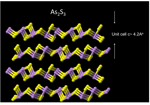 As2S3 comes in perfect 2:3 stoichiometry. After 250 growth trials in 3 years, perfect stoichirometry, large domain size, minimal defect density (1 parts in 100,000 unit cells), and perfected purity level (99.9998%) are achieved. In the bulk form, arsenic sulfide (As2S3) is a direct gap semiconductor and has band-gap at around 2.5 eV. Similar to molybdenum disulfide, it has layered structure (lamellar) with weak interlayer coupling and can be isolated down to monolayers. The monolayer thickness measures ~0.8 nm and the monolayer As_S_ is waiting to be discovered both experimentally and theoretically. Our crystals are large in size ~8mm and show remarkable PL characteristics. Our crystals are grown by state-of-the-art growth techniques over 8 weeks and show high crystallinity. Raman spectrum displays very sharp and clear modes with FWHM less than 6cm-1. As2S3 comes ready for exfoliation and is ideal for 2D research.