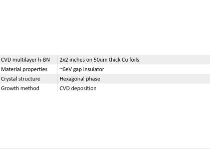 Multilayer h-BN (Boron Nitride) film is grown onto 50 um thick copper foils. h-BN is an insulator with a direct band gap of 6 eV with strong ionic bonding between B-N atoms. Our h-BN CVD process has been adopted in order that defect density has been kept low (~1E10-1E11 cm-2) and single domain sizes have been increased to reduce 1D grain boudary defect concentrations. Multilayer h-BN sheets measure ~5cm x 5cm or ~2x2 inches in size.