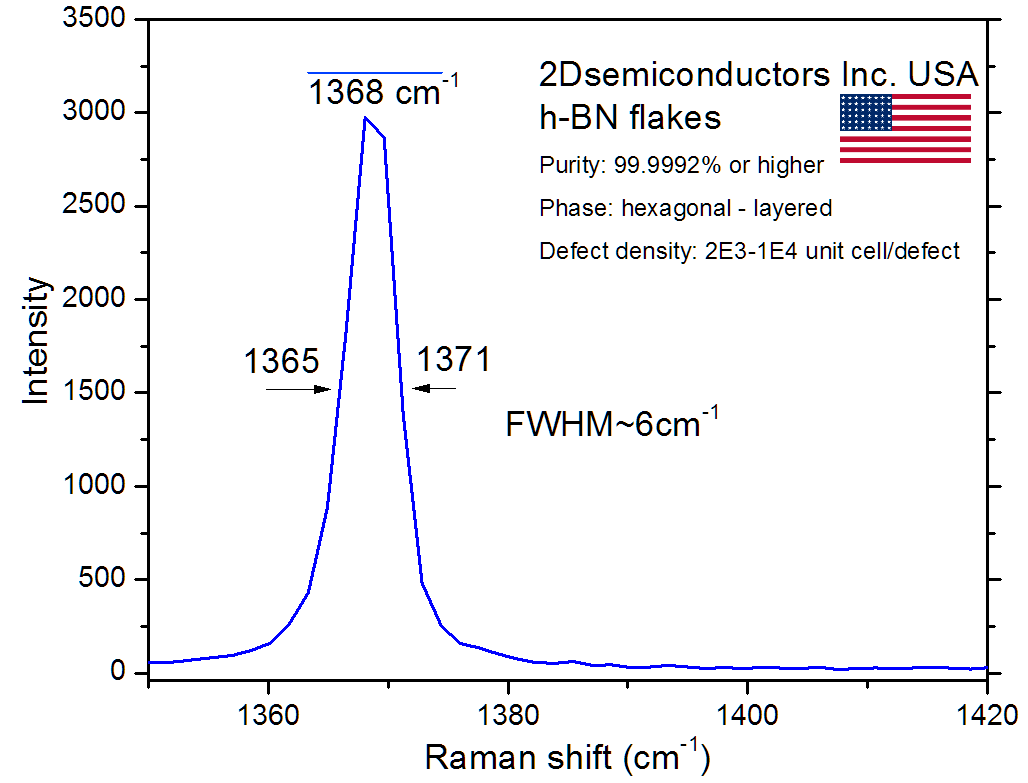 hBN flakes have ~2000-10000 defects/per unit cell, and possess ~6-7cm-1 FWHM Raman broadening. Raman spectrum matches well to the published data in the literature.