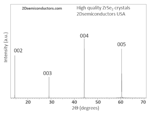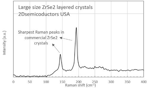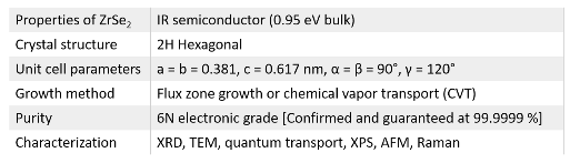ZrSe2 belongs to group-IV TMDCs family and adopts a stable 2H-hexagonal structure. ZrSe2 is 0.95 eV indirect gap semiconductor in the bulk form. These ZrSe2 crystals were designed and optimized at our facilities starting 2013 to achieve perfect electronic grade materials with: 1) excellent stoichiometry, 2) large single domain size, 3) single phase materials without any mixed phases or amorphous content, 4) unmatched purity -electronic grade (6N), 99.9999% confirmed purity. Our crystals exhibit sharpest Raman and XRD peaks in the commercial market proving the high quality of our materials.