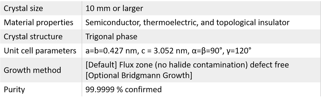 Antimony telluride is a topological insulator with the chemical formula of Sb2Te3. It crystallizes in an orthorhombic space group. Our Sb2Te3 crystals measure centimeters in size, rated at 99.9999% purity, and exhibit strong and sharp Raman signal, ideal environmental stability, and high crystalline order. Crystals are synthesized through flux zone technique to achieve extremely high crystallinity for advanced research applications and fundamental research projects.