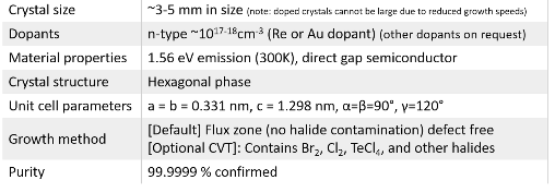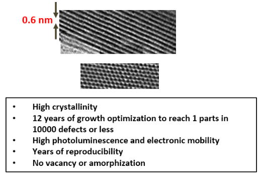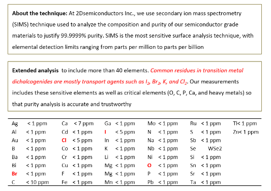 Growth method matters> Flux zone or CVT growth method? Contamination of halides and point defects in layered crystals are well known cause for their reduced electronic mobility, reduced anisotropic response, poor e-h recombination, low-PL emission, and lower optical absorption. Flux zone technique is a halide free technique used for synthesizing truly semiconductor grade vdW crystals. This method distinguishes itself from chemical vapor transport (CVT) technique in the following regard: CVT is a quick (~2 weeks) growth method but exhibits poor crystalline quality and the defect concentration reaches to 1E11 to 1E12 cm-2 range. In contrast, flux method takes long (~3 months) growth time, but ensures slow crystallization for perfect atomic structuring, and impurity free crystal growth with defect concentration as low as 1E9 - 1E10 cm-2. During check out just state which type of growth process is preferred. Unless otherwise stated, 2Dsemiconductors ships Flux zone crystals as a default choice.