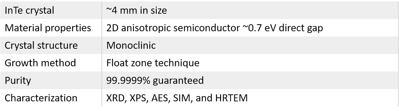 Our crystals are grown by state-of-the-art growth techniques after 5 weeks and show high crystallinity. The size of the samples is typically around ~4mm in size. InTe has a layered structure with weak interlayer coupling. Single crystal InTe comes ready for exfoliation and is ideal for 2D research.