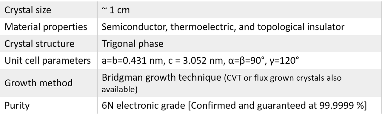 Bismuth Telluride (Bi?Te?) Developed at our facilities since early 2013 to optimize the perfect stoichiometry and stabilize the topological insulator state.Topological insulator is a new class of material, in which its bulk is insulating while its surface states are conducting. The surface states of topological insulator are robust against any external perturbation because such states are protected by time-reversal symmetry. Similar to transition metal dichalgonides and graphite, Bi?Te? is also layered material with weak interlayer coupling. Our crystals are develop in our laboratories in last two years and are highly crystalline. Raman spectrum displays very sharp and clear modes at 102 cm-1 and 134cm-1 with FWHM less than 4cm-1. If your research needs doping in Bi2Te3, we can also incorporate Ca, Nb, Ni, and Au dopants in Bi2Te3 crystals. Please also see our Tl alloyed Bi2Te3 crystals to advance your topological insulator studies.