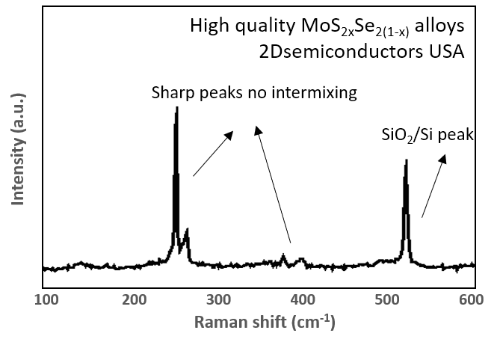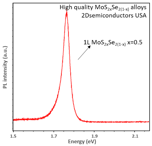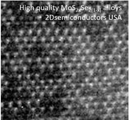 Our MoSSe alloys with the chemical formula MoS2xSe2(1-x) crystals perfectly crystallize in 2H phase and come at different alloy ratios x. Our crystals are grown using two different techniques through chemical vapor transport (CVT) or flux zone growth (see description of these two methods below) and their composition values were determined by XPS, SAED, and EDS measurements.. These crystals all possess extremely narrow PL bandwidths, display clean PL spectra, high carrier mobility, extremely clean and sharp XRD peaks, and negligible amount of defects (see published results as well as CVT vs. Flux based methods below ). These crystals come with guaranteed alloying and valleytronic response, sharp PL, and good electronic response.