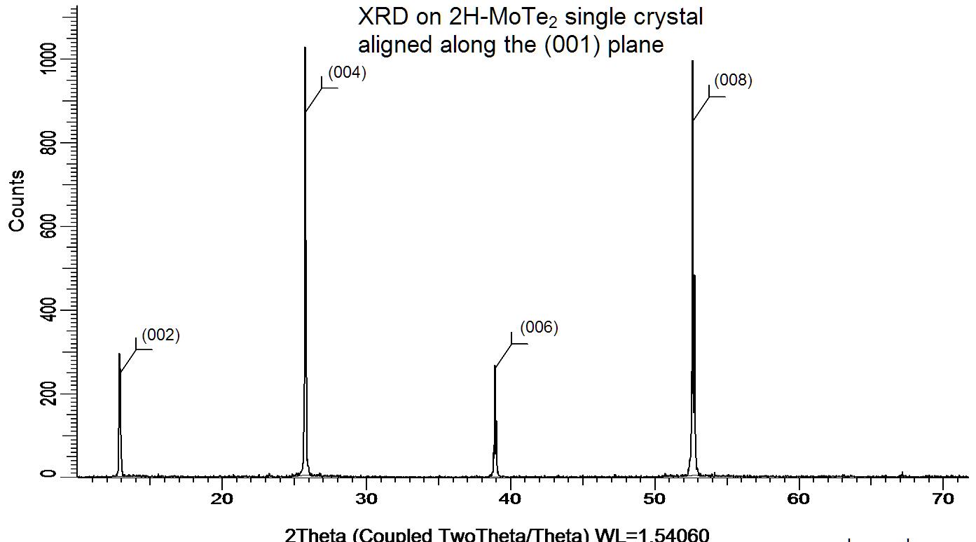 X-ray diffraction on a MoTe2 single crystal aligned along the (001) plane. XRD was performed at room temperature using a D8 Venture Bruker. The 4 XRD peaks correspond, from left to right, to (00l) with l = 2, 4, 6, 8