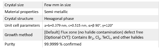 Growth method matters> Flux zone or CVT growth method? Contamination of halides and point defects in layered crystals are well known cause for their reduced electronic mobility, poor e-h recombination, low-PL emission, and lower optical absorption. Flux zone technique is a halide free technique used for synthesizing truly semiconductor grade vdW crystals. This method distinguishes itself from chemical vapor transport (CVT) technique in the following regard: CVT is a quick (~2 weeks) growth method but exhibits poor crystalline quality and the defect concentration reaches to 1E11 to 1E12 cm-2 range. In contrast, flux method takes long (~3 months) growth time, but ensures slow crystallization for perfect atomic structuring, and impurity free crystal growth with defect concentration as low as 1E9 - 1E10 cm-2. So if your research needs truly high quality crystals for optoelectronics, scanning tunneling microscopy, spectroscopy, and other projects that rely on defect free crystals, flux zone growth is ideal for you. However, if you need catalytic materials presence of defects typically helps and in such case CVT method is better suited. During check out just state which type of growth process is preferred. Unless otherwise stated, 2Dsemiconductors ships Flux zone crystals as a default choice.