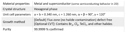 100% environmentally stable metallic NbSe2 crystals: In the bulk form, niobium diselenide is metallic. Similar to molybdenum disulfide, it has layered structure (lamellar) with weak interlayer coupling. NbSe2 displays metallic and superconducting behavior. Undergoes superconducting transition at low temperatures, exhibits CDW behavior. Unlike other sources, our NbSe2 crystals are grown by defect and impurity free flux zone technique (see the comparison between chemical vapor transport [CVT] below). Clean and defect free nature enabled researchers to observe clean superconductivity, phase transitions, and perform quantum transport measurements with confidence in the crystal.