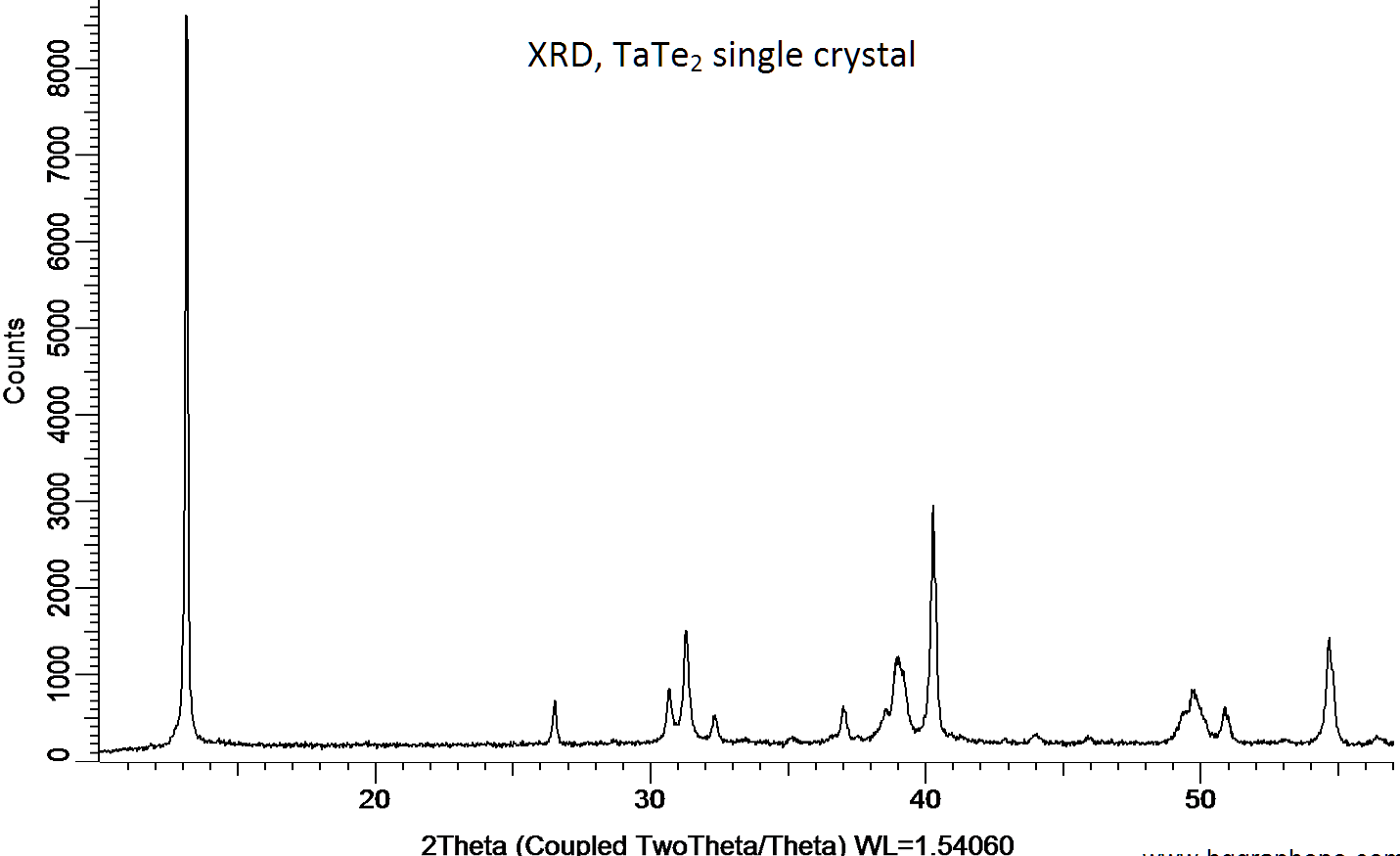 Powder X-ray diffraction (XRD) of a single crystal TaTe2. X-ray diffraction was performed at room temperature using a D8 Venture Bruker.
