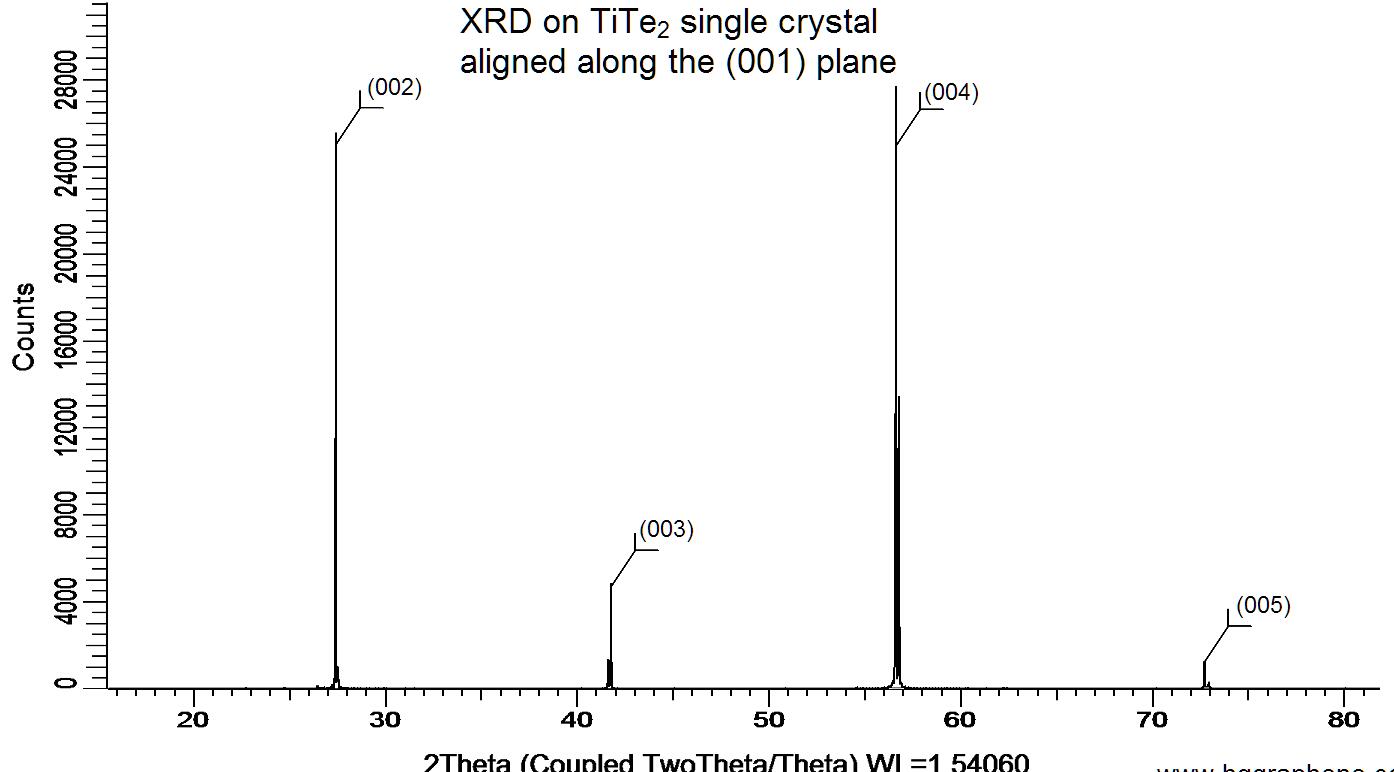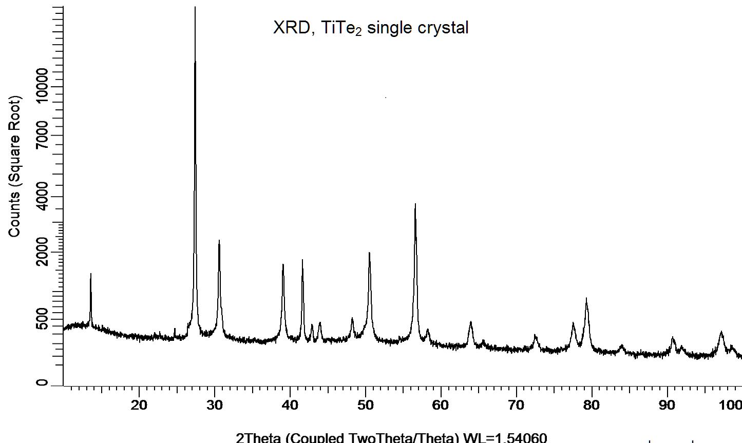 Powder X-ray diffraction (XRD) of a single crystal TiTe2. X-ray diffraction was performed at room temperature using a D8 Venture Bruker.