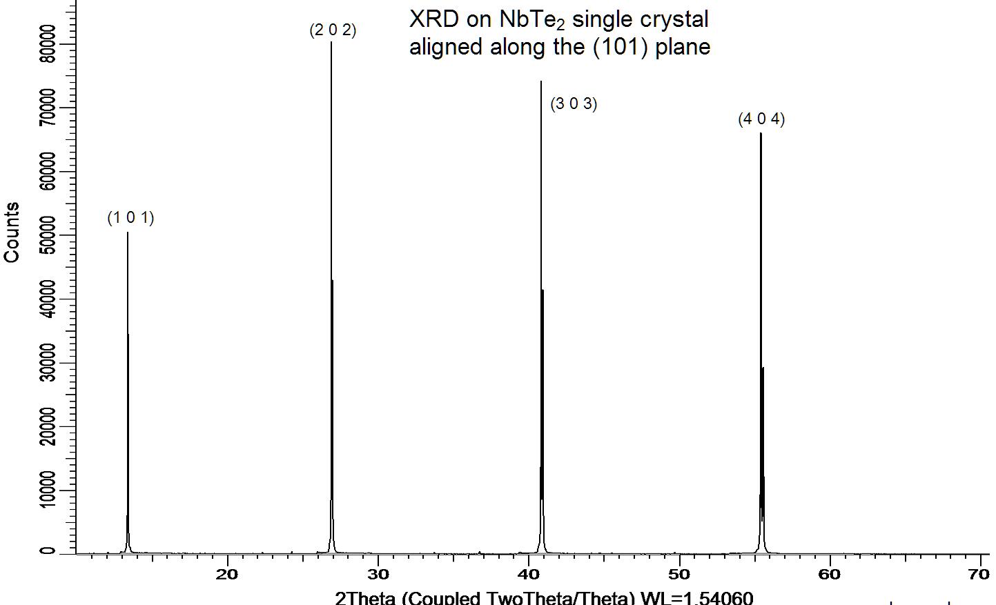 X-ray diffraction on a NbTe2 single crystal aligned along the (101) plane. XRD was performed at room temperature using a D8 Venture Bruker. The 4 XRD peaks correspond, from left to right, to (h 0 l), with h = l = 1, 2, 3, 4