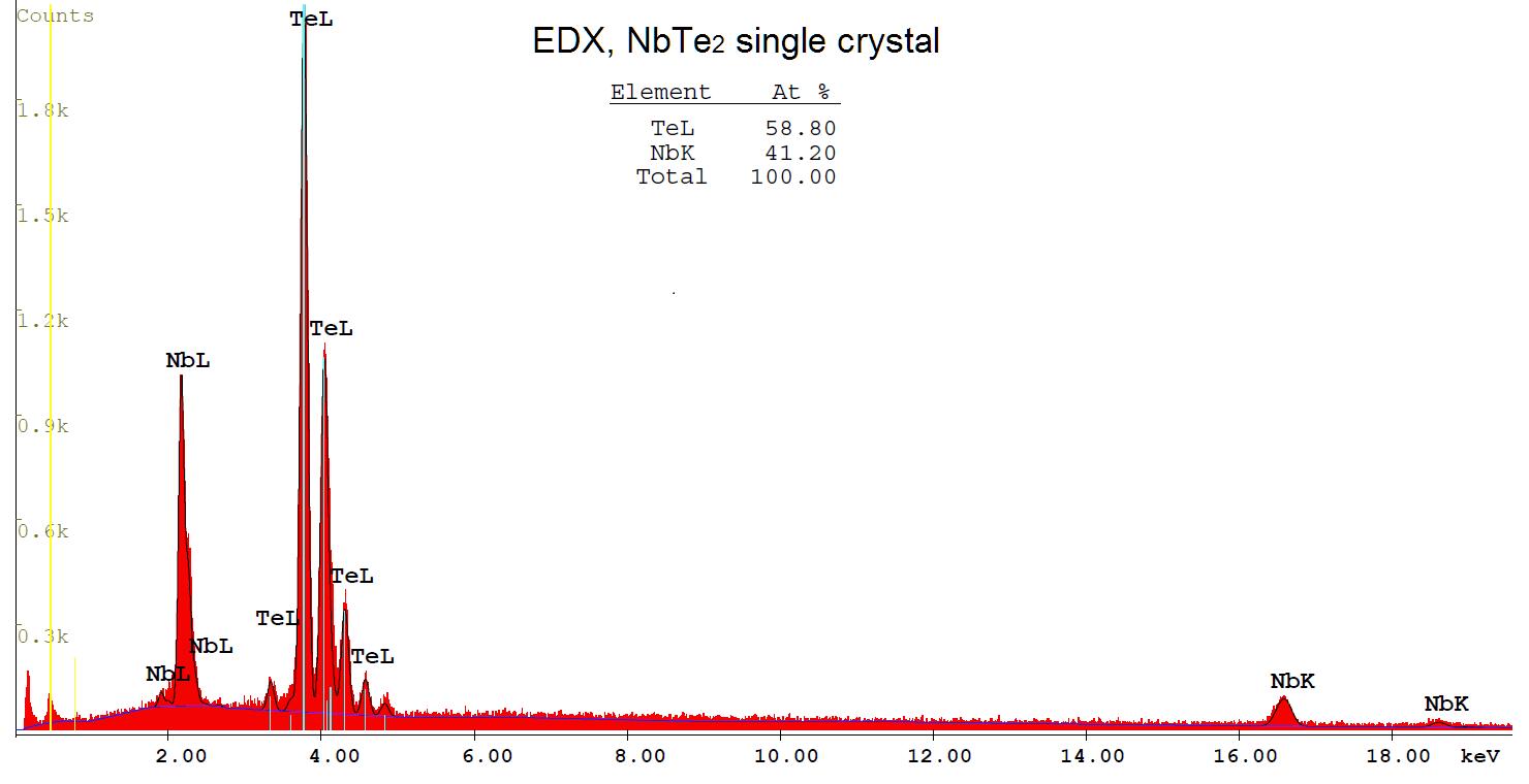 Stoichiometric analysis of a single crystal NbTe2 by Energy-dispersive X-ray spectroscopy (EDX).