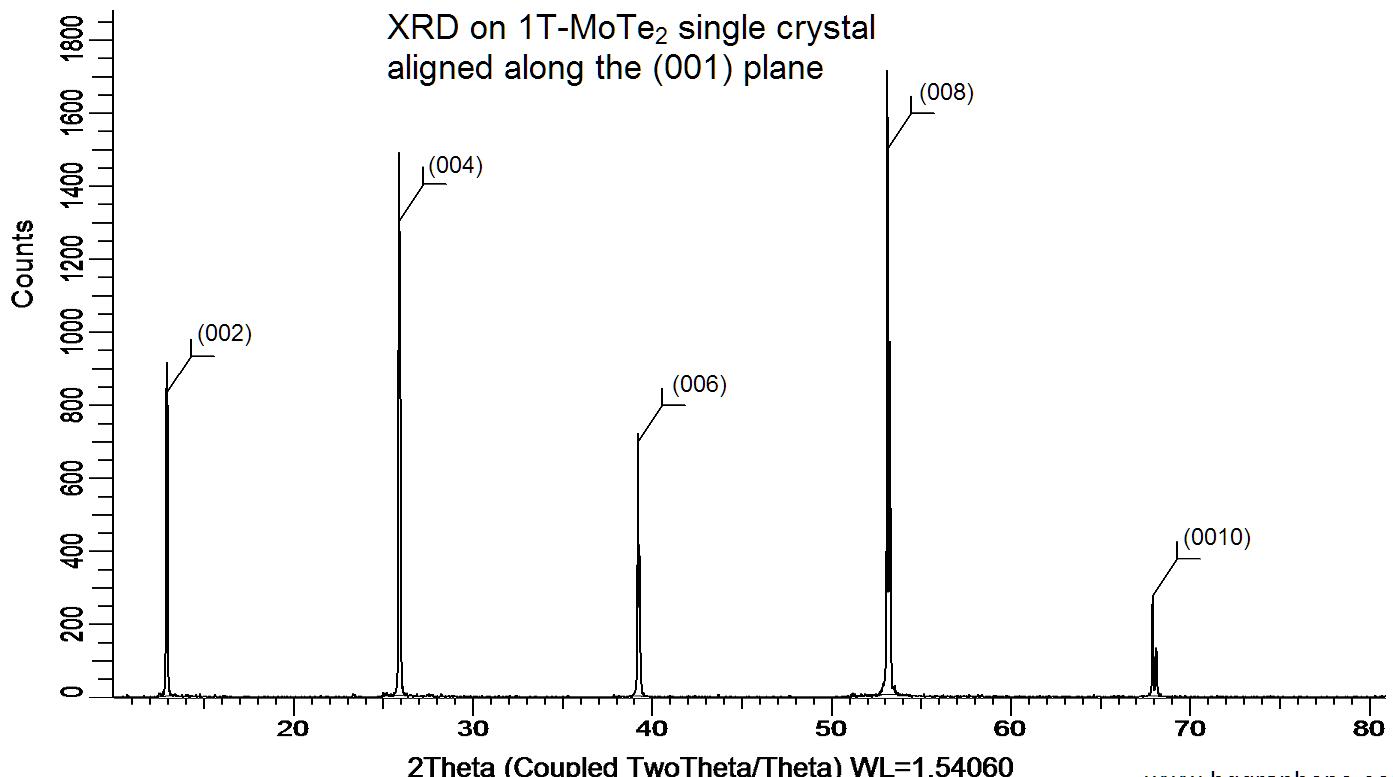 X-ray diffraction on a 1T'-MoTe2 single crystal aligned along the (001) plane. XRD was performed at room temperature using a D8 Venture Bruker. The 5 XRD peaks correspond, from left to right, to (00l) with l = 2, 4, 6, 8, 10