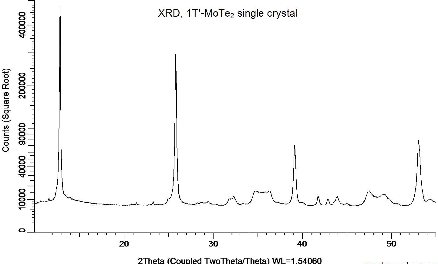 Powder X-ray diffraction (XRD) of a single crystal 1T'-MoTe2. X-ray diffraction was performed at room temperature using a D8 Venture Bruker.