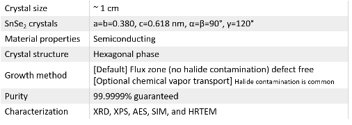 In the bulk form SnSe has band-gap at around 0.9 eV (indirect) and 1.25 direct gaps. It has layered structure (lamellar) with weak interlayer coupling, enabling to isolate down to monolayers. Each monolayer is four atoms thick (Se-Sn-Sn-Se) that is roughly 0.9-1.0 nm. At high pressures it undergo semiconductor to superconductor transition. More recently, SnSe has been shown to display world record performance for thermoelectric material efficiency.
