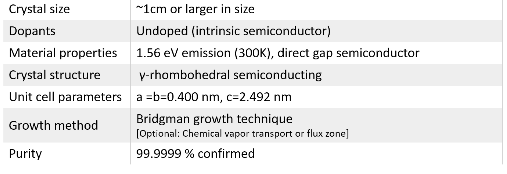 InSe (indium selenide) is the first commercially available InSe layered materials in the field. Our single crystal InSe crystals come with guaranteed optical, electronic, and structural anisotropy. They are developed at our facilities using three different state-of-art techniques: i) Bridgman growth, ii) flux zone growth, and iii) chemical vapor transport (CVT) growth. The latter (CVT) produces contaminated samples. Flux zone technique is suitable for good crystallization but crystal sizes are limited to ~5mm. In contrast, Brigmann method offers good crystallinity as well as large size (larger than 1cm). Each crystal is highly crystalline, oriented in 0001 direction, and easy to exfoliate. Our R&D staff takes characterization dataset in each sample piece to ensure structural, optical, and electronic consistency.