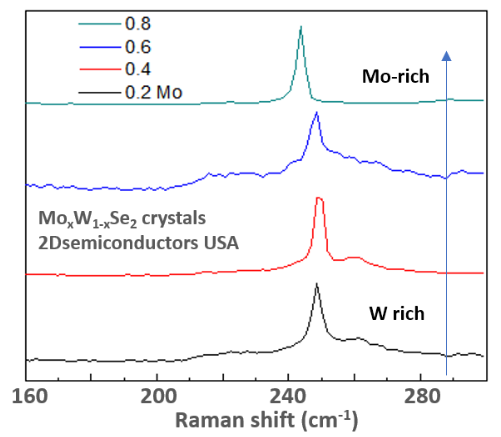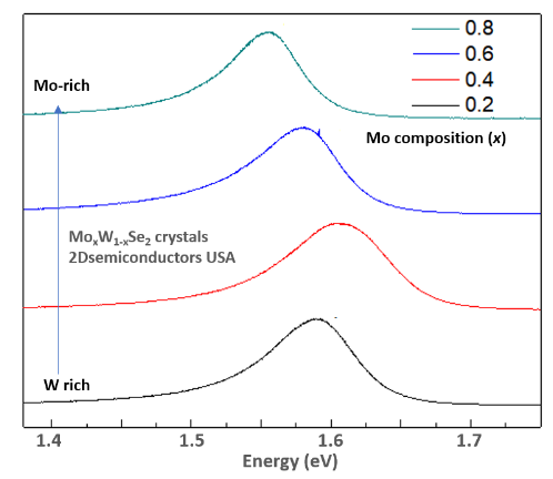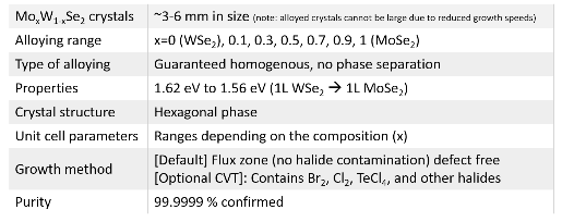 Our MoWSe2 alloys with the chemical formula MoxW(1-x)Se2 crystals perfectly crystallize in 2H phase and come at different alloy ratios x. Our crystals are grown using two different techniques through chemical vapor transport (CVT) or flux zone growth (see description of these two methods below) and their composition values were determined by XPS, SAED, and EDS measurements.. These crystals all possess extremely narrow PL bandwidths, display clean PL spectra, high carrier mobility, extremely clean and sharp XRD peaks, and negligible amount of defects (see published results as well as CVT vs. Flux based methods below ). These crystals come with guaranteed alloying and valleytronic response, sharp PL, and good electronic response.