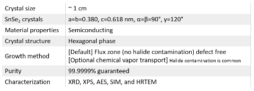 World record size single crystal SnSe? (Tin diselenide) crystals are developed at our facilities using state-of-art techniques. All the crystals are ready to exfoliate as shown in the images. Crystals are larger than 1cm in size giving you plenty of material to work with. In the bulk form SnSe? is 1.0 eV direct band gap semiconductor and becomes 1.4 eV direct semiconductor in the monolayer form. Displays remarkable and unusual optical, mechanical, and electrical properties that are waiting to the published in the literature. Yet, monolayer SnSe? remains unknown by the scientific community and waiting to be discovered. Crystals are highly crystalline with very sharp Raman peak signal at 109 and 182 cm-1 with FWHM less than 4cm-1. They are developed at our facilities using state-of-art flux zone techniques. Each growth takes close to three months to provide you perfected crystals that does not contain any halides. In contrast to commonly used chemical vapor transport (CVT) technique, flux grown crystals are well known for their structural perfection and electronic/optical performance. Each crystal very large in size to last for years, is highly crystalline, oriented in 0001 direction, and easy to exfoliate. Our R&D staff takes characterization dataset in each sample piece to ensure structural, optical, and electronic consistency.